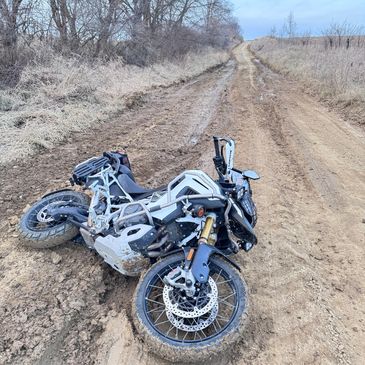 My second pass on this same Level-B occurred a few weeks ago. It was dusk and it came up fast. Making it 30+ feet into a clay-muddy mess on Dunlop Missions was my best effort. It's the WRONG tire. It completely consumed me. Mud was 8 to 12 inches deep. I returned after a few weeks. I saw a dry line between puddles. This high point was a sponge. I was thrown into another track as the front tire sank. I had overcorrected, which caused me to fall into the other puddle. The windshield broke off, and I broke off the screen button with my thumb.